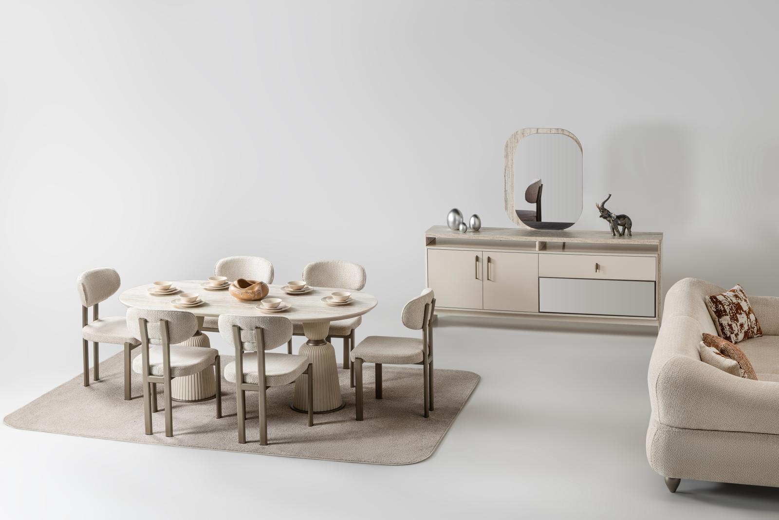 Der Set besteht aus einem Esstisch, 6 Stühlen, Sideboard mit Spiegeln ,TV-Unterschrank und Couchtisch